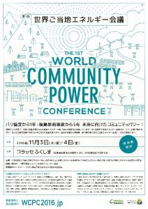 パリ協定から1年福島原発事故から5年 未来に向けたコミュニティパワー!11/3(木・祝)・4(金)第1回世界ご当地エネルギー会議開催参加費無料! 「第1回世界ご当地エネルギー会議」実行委員会は、日本と世 界の「ご当地エネ […]